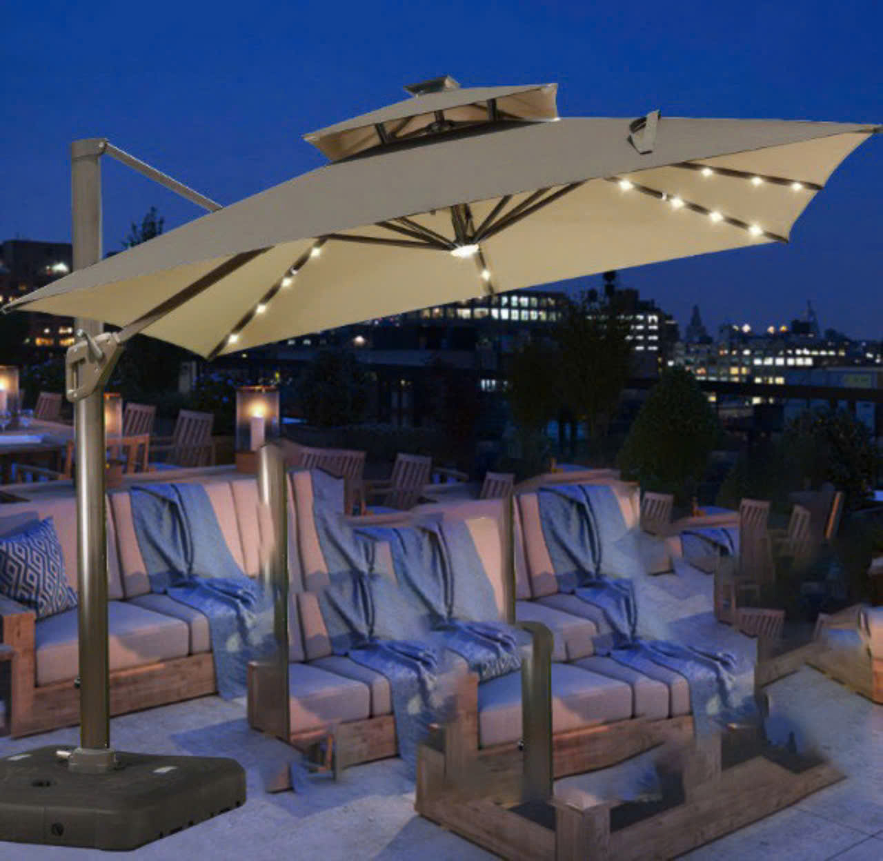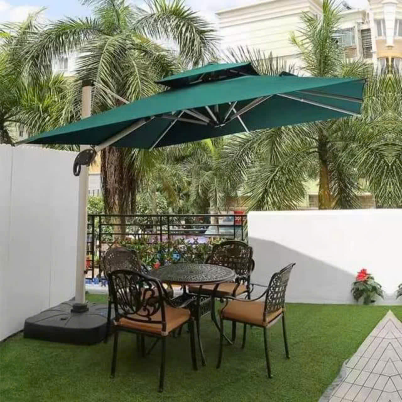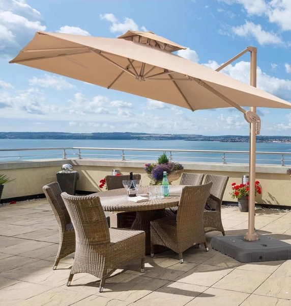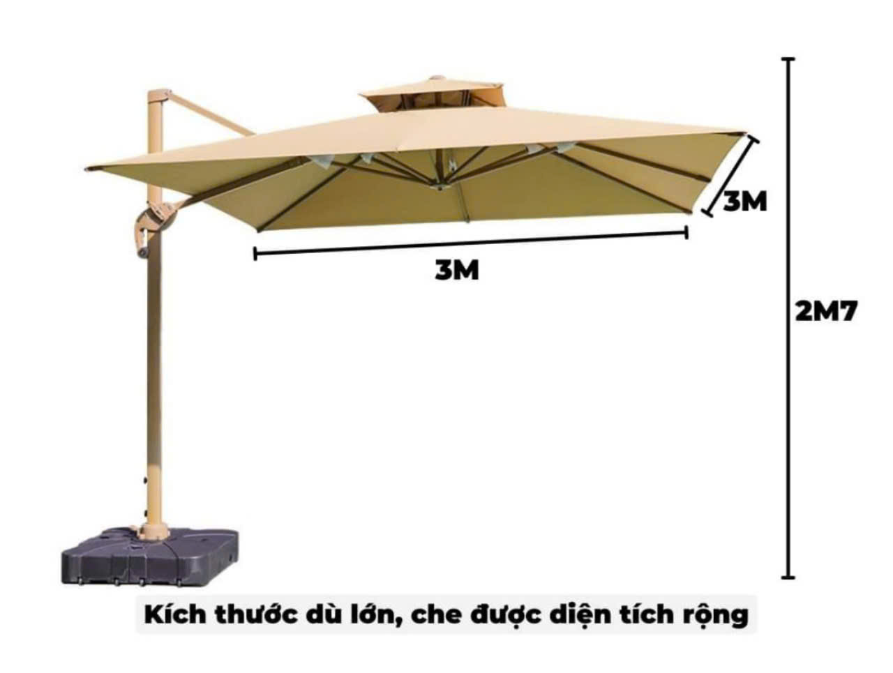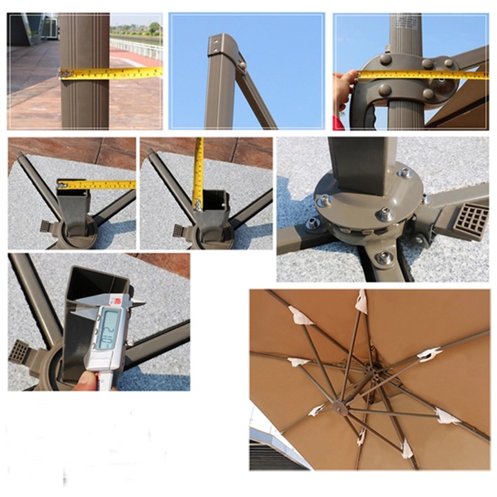 Ô dù lệch tâm vuông có3mx 3m được Dù che Nguyên Thư nhập khẩu và phân phối với chất liệu khung ô làm bằng hợp kim nhôm và phần dù che được sử dụng chất liệu vải polyester đây là loại vải rất được phổ biến trên thị trường hiện nay, sợi vải polyester có nhiều ưu thế sơn so với các loại vải sợi truyền thống là không hút ẩm nhưng hất thụ dầu chính nhờ vào những đặc điểm này mà nó rất phù hợp để sử dụng ở những khu nghỉ dưỡng, như resort, khu biệt thự, khu nhà vườn, khu đô thị sinh thái, nhà hàng, khách sạn….