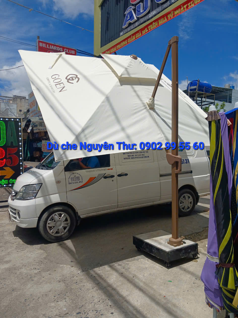 Đến với Dù che Nguyên Thư chúng tôi chuyên sản xuất và phân phối các loại ô dù lệch tâm, ô vuông, ô tròn che nắn, mưa, và trang trí cho quán café, nhà hàng, khách sạn, sân golf, resort, bể bơi, trường học….