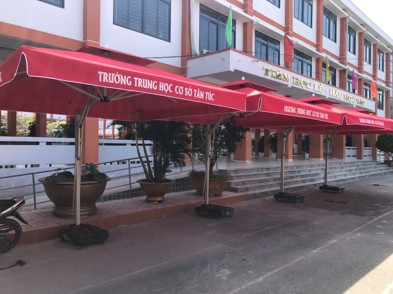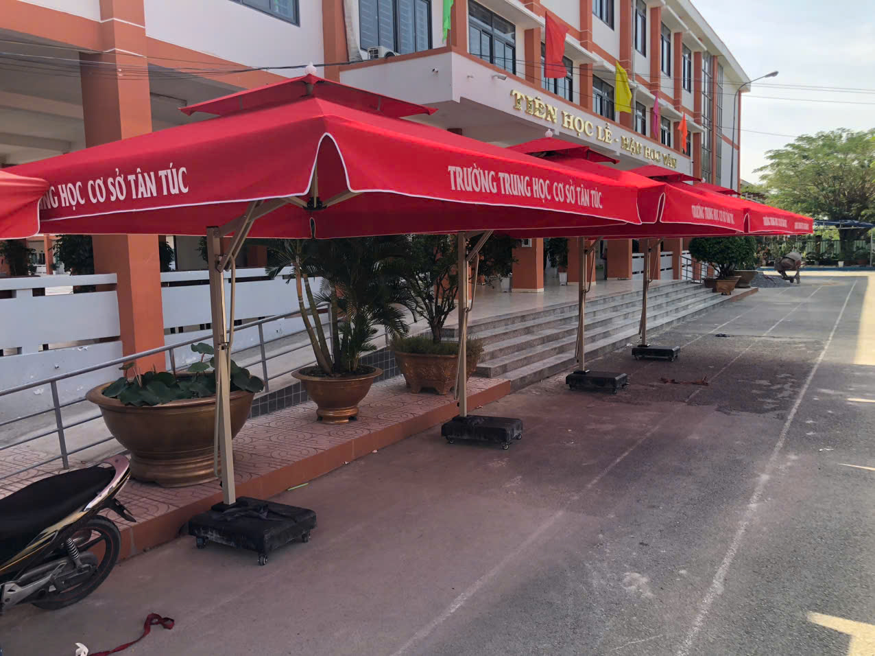 Những hình ảnh thực tế lắp đặt dù che tại các trường học cho thấy sự chuyên nghiệp, đồng bộ và hiệu quả rõ rệt trong việc vừa bảo vệ không gian sinh hoạt ngoài trời, vừa truyền thông thương hiệu một cách tự nhiên, lâu dài.